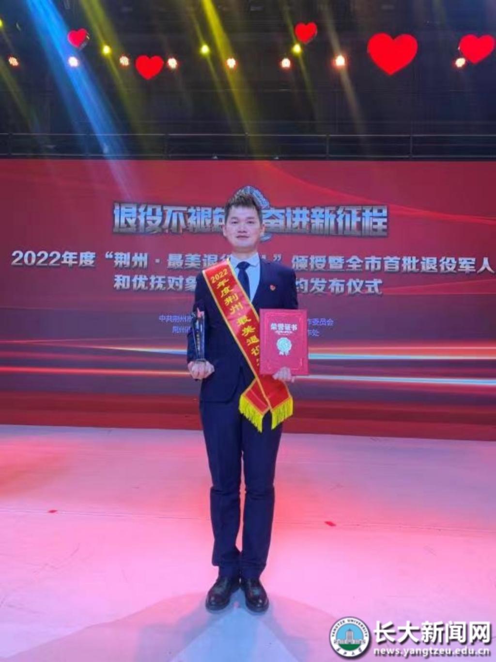 新闻网讯(通讯员 谢海红)2月24日,2022年度“荆州·最美退役军人”名单公布,公司太阳集团tyc539博士研究生、退役军人叶泛获此殊荣,当天参加了在荆州广播电视台举办的颁授仪式。