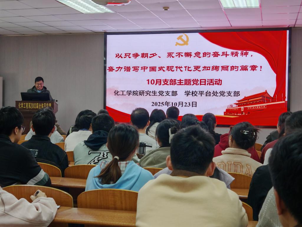 活动伊始,全体党员肃立重温入党誓词,铮铮誓言坚定初心;随后有序交纳本月党费,以行动强化组织观念。理论学习环节,张文杰老师领学《中国共产党章程》(总纲部分),助党员深化理解、夯实思想根基;他还以“筑牢思想根基,扛起科研担当”为题讲授党课,结合化工科研实际号召党员围绕前沿方向和国家重大战略开展科学研究,产出高质量科研成果。现场组织观看湖北省反腐系列视频,强化党员作风建设。