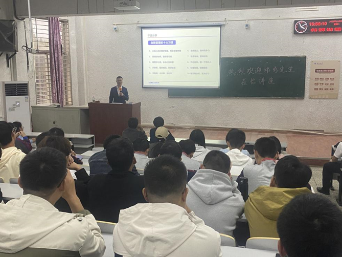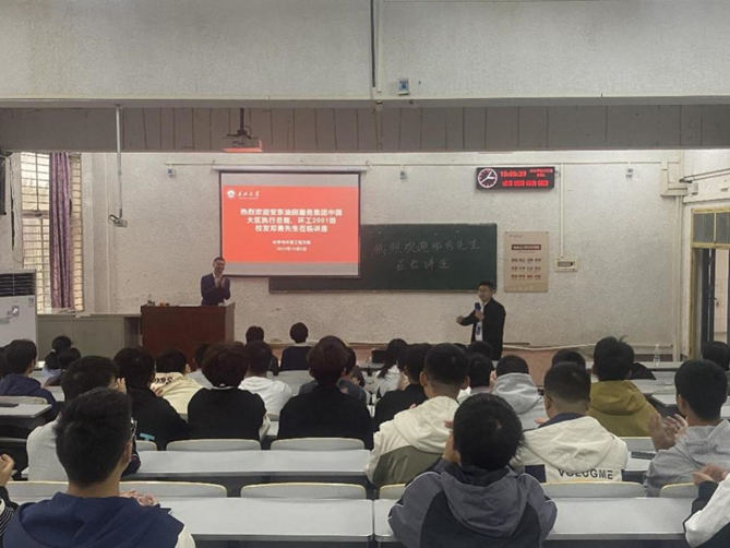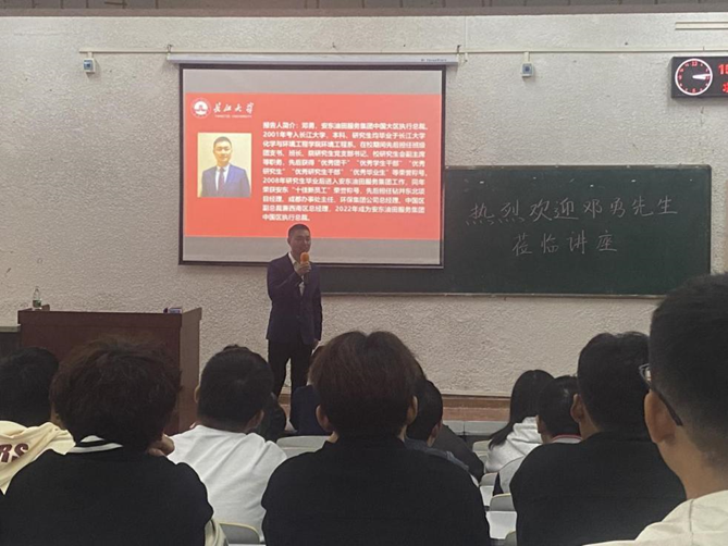 邓勇向同学们介绍了安东油田服务集团的整体情况,同时介绍了自己在安东石油一步一步从基层做起,深入钻井现场、开辟东北业务、西南业务的工作经历,很短时间内带领公司西南办事处实现销售收入破“亿元”;后来先后担任公司环保集团公司经理、中国区副总裁兼西南区总经理、中国大区执行总裁。他结合自己的求学工作经历以及安东企业文化,向同学们分享自己的人生感悟。他表示,人因梦想而伟大,更因行动而成功。他勉励同学们要拿出勇气,拿出干劲,继续奔跑、不懈奋进,阔步新征程,昂首向未来。他向同学们分享了自我管理的十大习惯,希望同学们可以从中获得感悟,成为一名有理想、敢担当、能吃苦、肯奋斗的时代新青年。