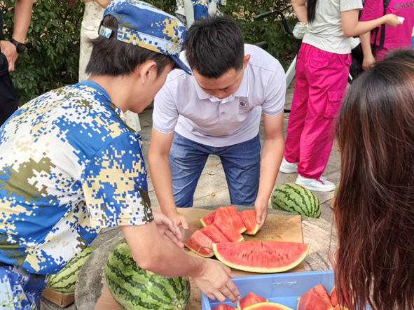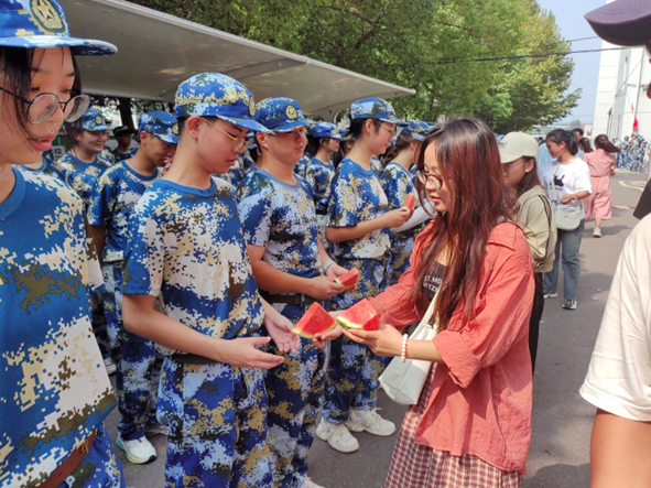 在欢声笑语中,老师和同学们将切好的西瓜一一分发给军训同学和辛勤的教官们,带来公司的祝福和慰问,让他们深切感受到太阳集团tyc539大家庭的温暖和热情。