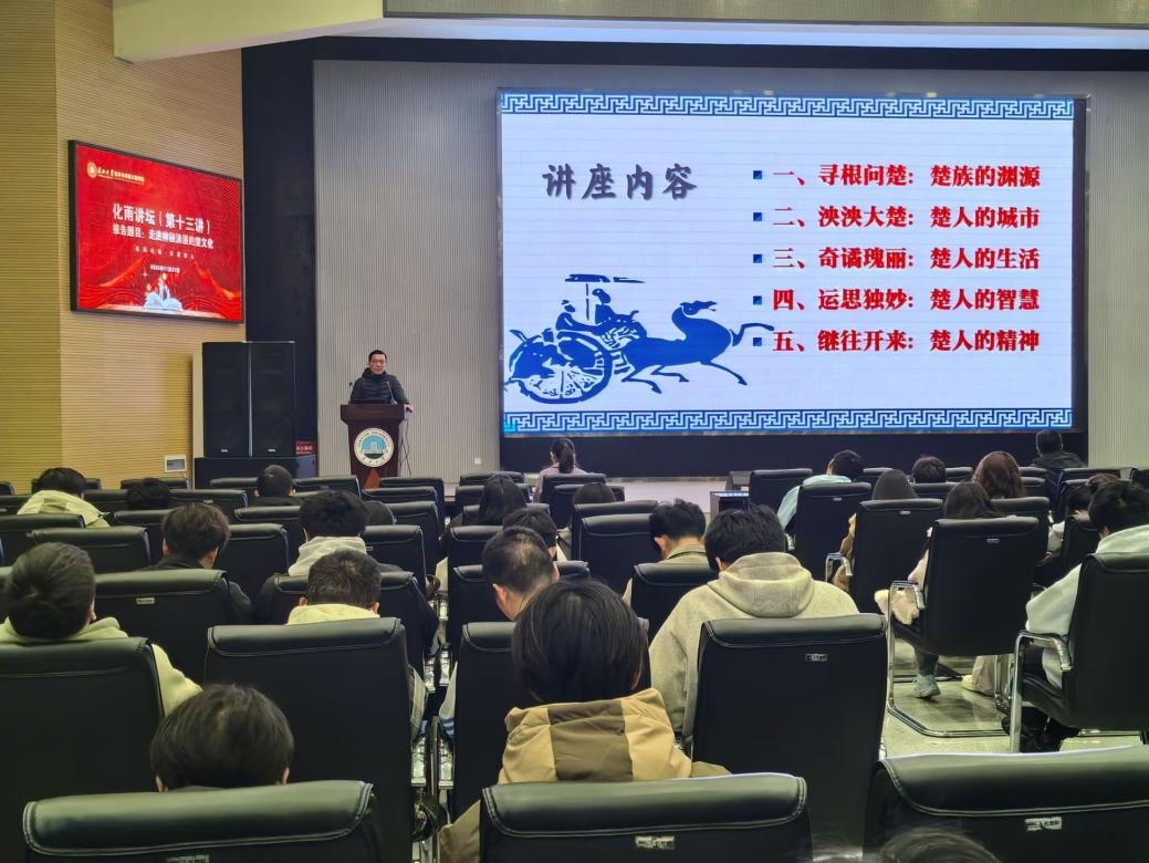 (通讯员 刘晓芳)2025年11月21日下午,太阳集团tyc539在西校区农科大楼1058报告厅举办化雨讲坛第十三讲——“走进神秘浪漫的楚文化”专题讲座。本次讲座特邀人文与新媒体公司历史系主任、荆楚文化研究中心副主任卢川老师主讲。公司党委副书记杨会军、辅导员徐茵及2025级全体员工共同参与。