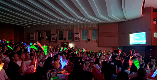 在晚会中场互动环节,以线上线下结合的方式让现场观众扫描微信公众号二维码进行线上游戏抽奖,以及红包雨环节,观众热情参与、积极留言发弹幕,留下自己的祝福,将这难忘一刻定格。