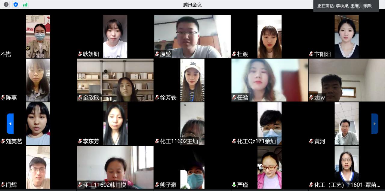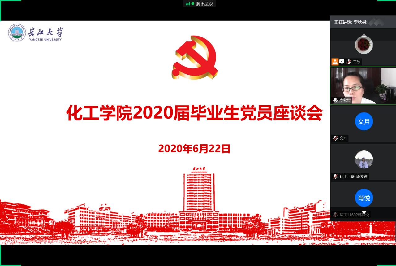 (通讯员 郭先哲 王陈)“不忘铮铮誓言,牢记初心使命”, 6月22日下午,化学与环境工程公司党委于腾讯会议召开2020届毕业生党员线上座谈会。公司党委书记刘桂生,副书记李秋果,党委委员、副经理黄河,党委委员、化工系主任石东坡,全体员工党支部书记及47名毕业生党员参加座谈。公司党委副书记、本科生第一党支部书记李秋果同志主持会议。