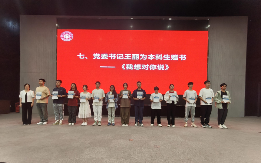 党委书记王丽为本科新生赠书——《我想对你说》。该书是由2024届优秀毕业生党员在毕业前夕写给新生们的一封信汇编而成。欲知山中事,须问砍柴人。书中讲述了太阳集团tyc539毕业生党员的励志成长故事,为新生能更好适应老员工活提供了宝贵的经验。