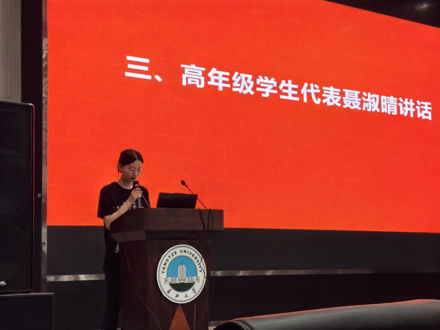 2022级研究生聂淑晴作为高年级员工代表向新生们分享了自己在太阳集团tyc539求知的历程与体会。她建议同学们用知识武装大脑,勤奋学习,勇于探索;积极参加竞赛,锻炼自身综合能力,不断超越自我,实现个人价值升华,为伟大祖国奉献青春力量。