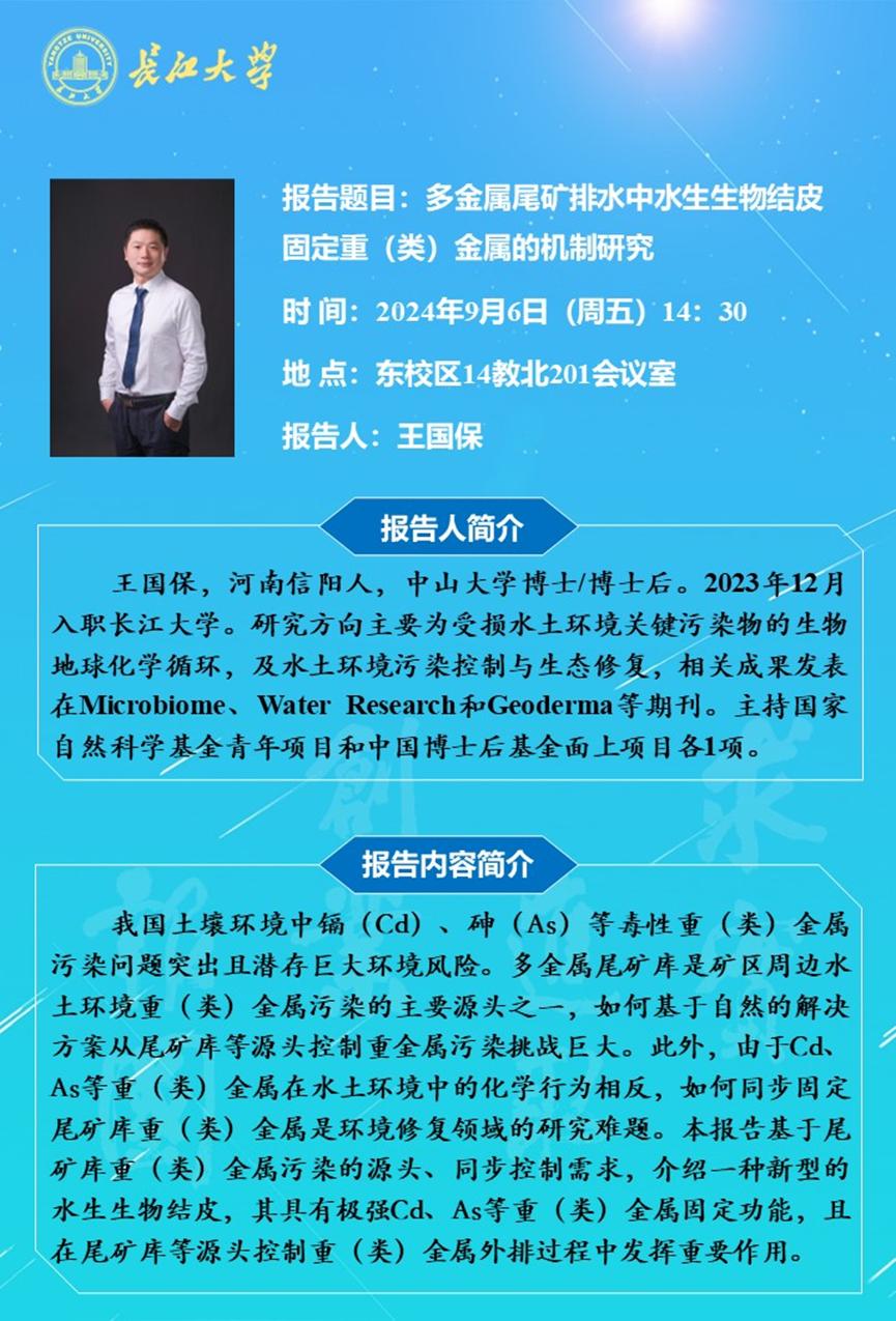 长江化工讲坛:多金属尾矿排水中水生生物结皮固定重(类)金属的机制研究