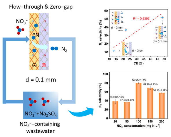 电催化还原硝酸盐(NO3−)为N2是解决硝酸盐污染的有效途径。当我们分析NO3-还原反应机理时,不难发现通过耦合两个吸附态的原子氮(*N)生成N2的途径是最短的路径。然而,先前研究中NO3−电还原为N2的选择性总是很低。这可能是由于催化剂表面过量的原子氢(H*)生成,且含氮中间体氢化作用的活化能远低于N−N耦合反应。合理假设,如果吸附态*N的覆盖强度能够提高到与吸附态*H相比具有竞争力的水平,那么N−N耦合反应很有可能成为主要途径。据报道,催化剂表面电子的有效利用和反应物的富集都有可能促进*N的覆盖强度。目前,流通式(Flow−through)电化学反应器具有增强的质量传输、高效的电子传输和能耗低等优点,正在成为一种有吸引力的替代反应器结构。然而,在流动反应过程中粉末催化剂可能会受到颗粒磨损和失活的影响,导致反应活性降低,构建三维的流动阴极可以弥补粉末催化剂的不足。此外,电极间距是反应器构型的关键参数,直接影响质量传输、电流分布和电极利用效率。因此,利用高效稳定的流动阴极和控制Flow−through系统的电极间距,是解决反应动力学和N2选择性相关难题的有效方法。本研究通过实验和有限元模拟,研究了电极间距(d = 3 cm、3 mm和0.1 mm)对电催化硝酸盐还原性能的影响,尤其是对N2选择性的影响;通过中间产物鉴定和理论计算,揭示了零极距电化学体系中*NO到*N的高选择性转化和N−N耦合步骤在电催化还原NO3−为N2的过程中发挥关键作用。