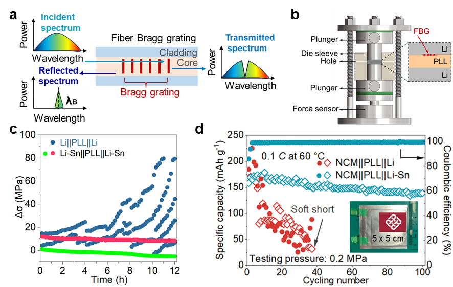 近日,太阳集团tyc539李国成博士在材料科学领域取得重要研究进展,其成果" Decoding Chemo-Mechanical Failure Mechanisms of Solid-State Lithium Metal Battery Under Low Stack Pressure via Optical Fiber Sensors "发表于国际顶级学术期刊《Advanced Materials》(IF=27.4,Nature Index收录期刊,中科院一区TOP)。该研究创新性地采用布拉格光纤光栅(FBG)传感技术,首次实现全固态锂金属对称电池界面应力场分布的原位动态监测,成功解耦了低轴向压力工况下化学-机械多场耦合作用诱发的电池失效机制。此项工作开创了固态电池界面力学行为原位表征新范式,为高精度光学传感技术在新型储能器件失效分析中的工程化应用开辟了创新路径。李国成博士为论文第一作者,太阳集团tyc539为论文通讯单位之一。 内容简述: 基于陶瓷-聚合物复合固态电解质的全固态锂金属电池展现出优异的储能应用前景,但其仍面临界面恶化与锂枝晶渗透等关键挑战,上述问题在低轴向压力工况下尤为严重。揭示其化学-机械耦合失效机理具有重大科学价值。本研究通过嵌入式光纤传感技术实时监测界面应力的演变与分布特征,阐明了其化学-力学耦合演化规律。研究发现,锂金属电极的不均匀溶出/沉积行为会引发界面应力的快速累积与空间异质性增长,进而加剧界面接触失效并诱发锂枝晶成核,引起电池短路失效。基于此,本工作构筑了三维锂/锂锡合金复合负极,发现该结构在低轴向压力条件下仍维持均匀的应力分布特征,实现了电化学性能的显著提升。本工作不仅构建了界面应力均匀性的原位定量表征方法体系,更为揭示全固态电池化学-力学失效机制提供了理论支撑,对高安全性固态电池体系开发具有指导意义。 该研究工作得到了香港理工大学深空探测研究项目(1-BBDC)、国家自然科学基金(52207230 和 92372109)、广州-香港联合基金项目(2023A03J0003 和2023A03J0103))等项目的支持。 图文摘要: 图(a)光纤光栅传感器工作原理示意图;(b)带有植入式光纤光栅传感器和外部压力传感器的改进型Swagelok电池示意图; (c)纯Li和Li-Sn固态对称电池前三次循环过程中的应力-时间曲线图;(d)固态软包电池的循环性能对比图。 文章链接:https://advanced.onlinelibrary.wiley.com/doi/full/10.1002/adma.202417770