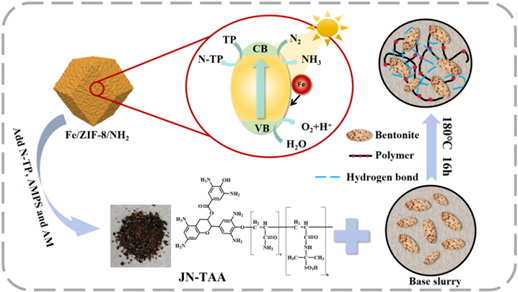 罗霄副教授课题组以茶多酚作为切入点,通过光驱动固氮-胺化-聚合一步路线:对茶多酚进行光催化固氮胺化,再与2-丙烯氨基-2-甲基丙磺酸(AMPS)和丙烯酰胺(AM进行光催化聚合,得到一种新型的抗温耐盐型降滤失剂JN-TAAJN-TAA与膨润土间强氢键作用及聚合物自交联能力的协同作用,提高了降滤失剂在高温高盐环境下的稳定性。此外,采用ZIF材料作为光催化剂,进一步提升了光生电子空穴的分离效率,使固氮胺化反应在可见光区高效进行。这一路线为光催化固氮、绿色抗温耐盐型降滤失剂的合成提供了新思路。